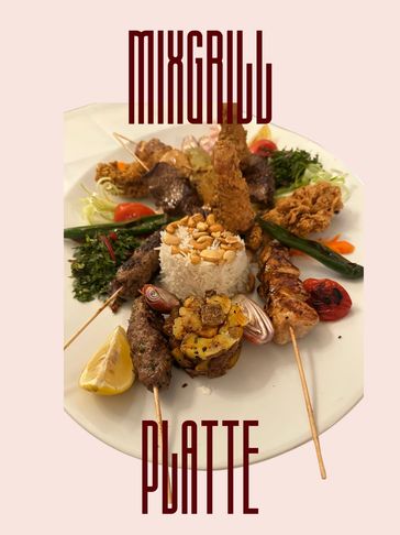 Ein Festmahl vom Grill: Hähnchen, Kabab und Filetspieß, begleitet von Batata Harra, Basmati-